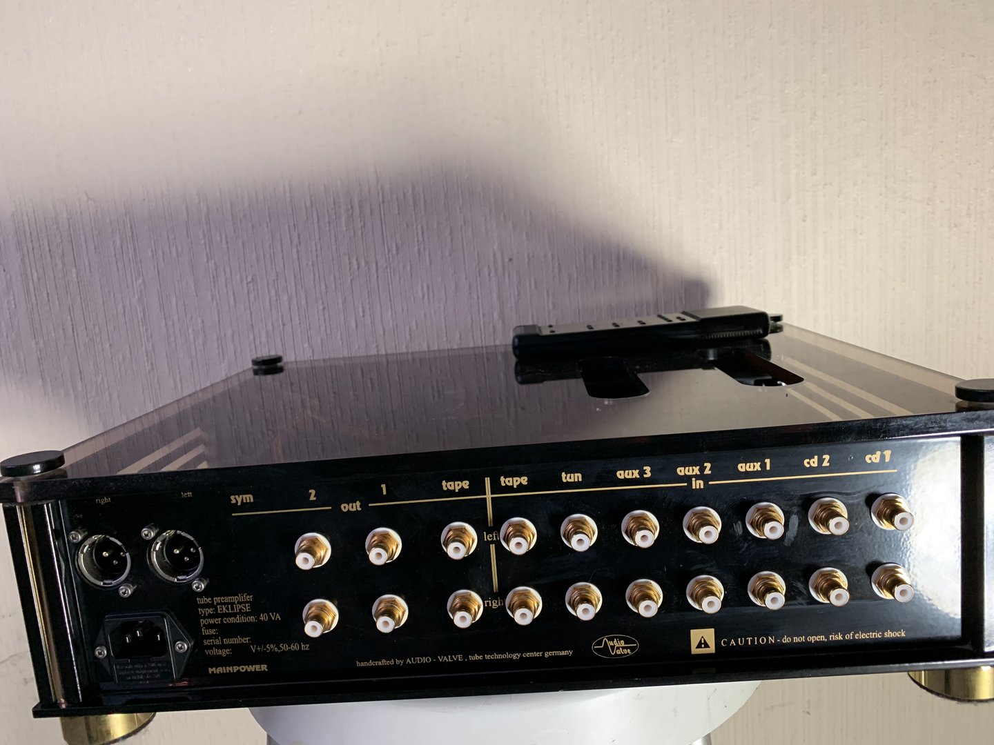 Audio valve Eklipse forforsterker, Audiovalve Baldur 70 monoblokker, Audio aero capitole cd spiller, Sonus Faber Cremona høytalere, med soundcare spike. Kabler er Kimber select serien.