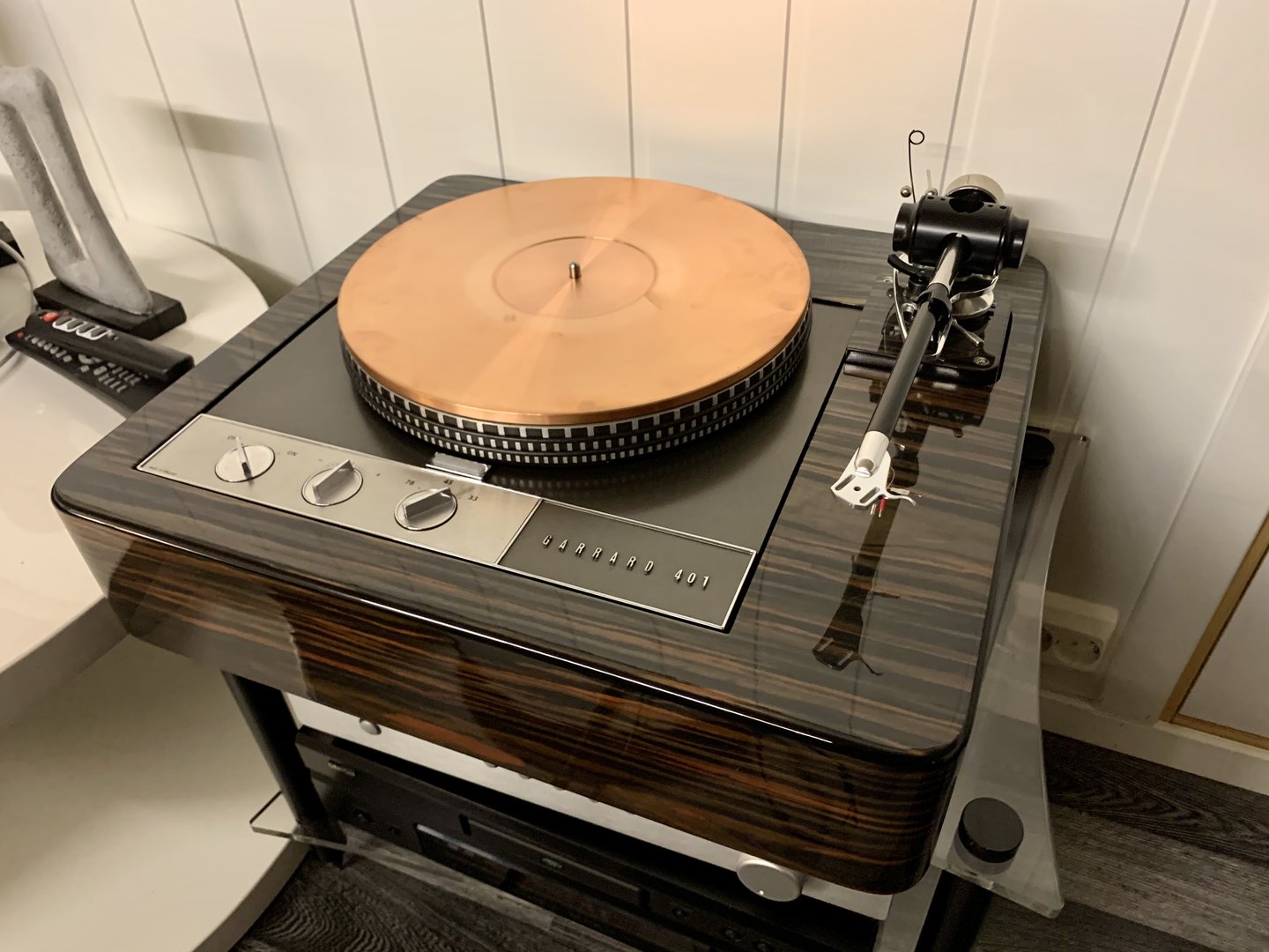En alldeles nydelig Garrard 401 i mørk ebony finért plinth. Armen er en flett ny Origin Live Conqueror mk.III.