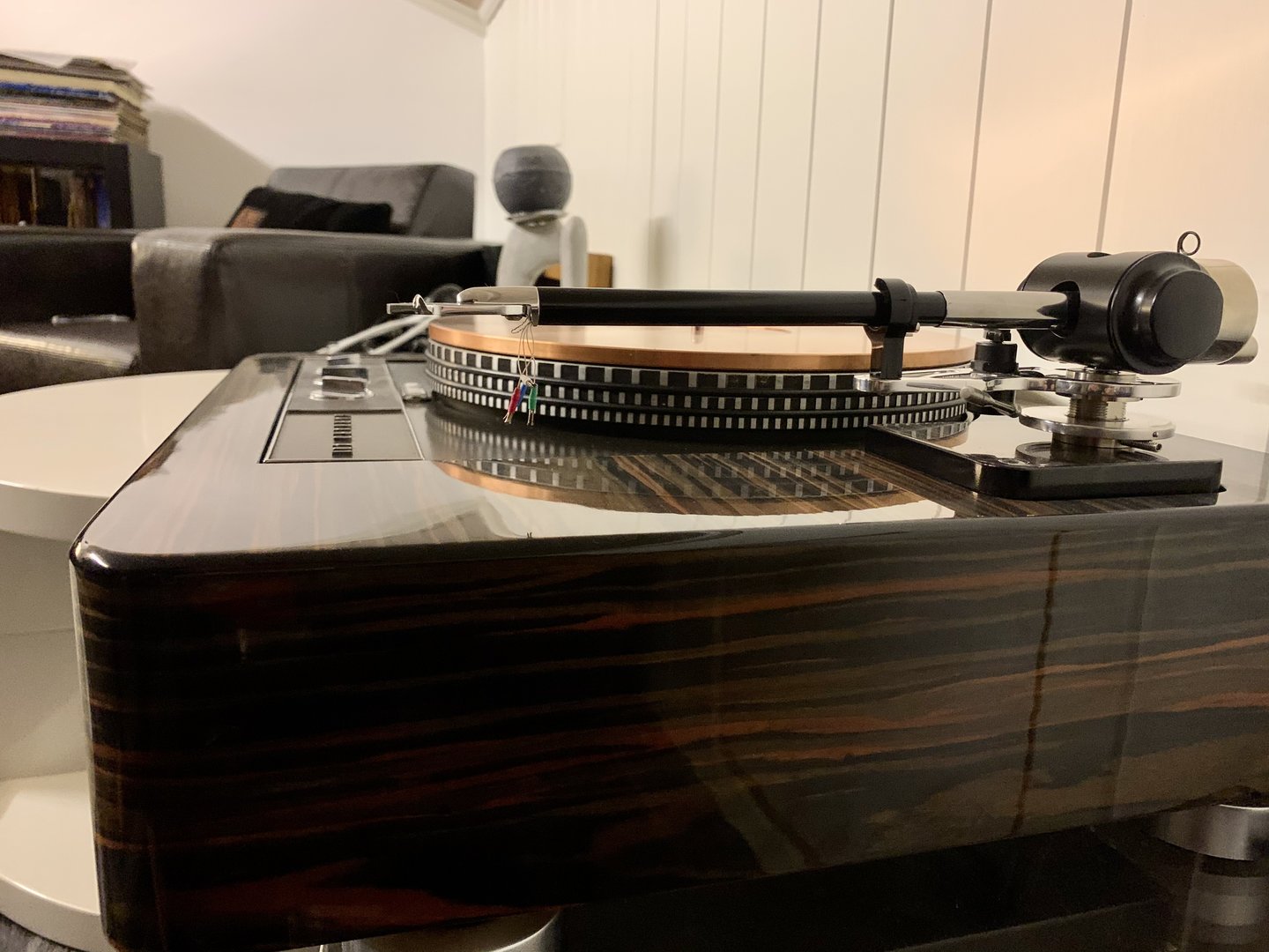 Selve drivverket er kyndig gjennomgått og lageret er oppgradert til rustfritt stål typen til Peak Hifi med ekstra lang spindel for bruk av den tunge messingmatten som du ser oppå. Her kan det også medfølges en lik matte bare i porselen om man vil veksle. Det låter ikke likt