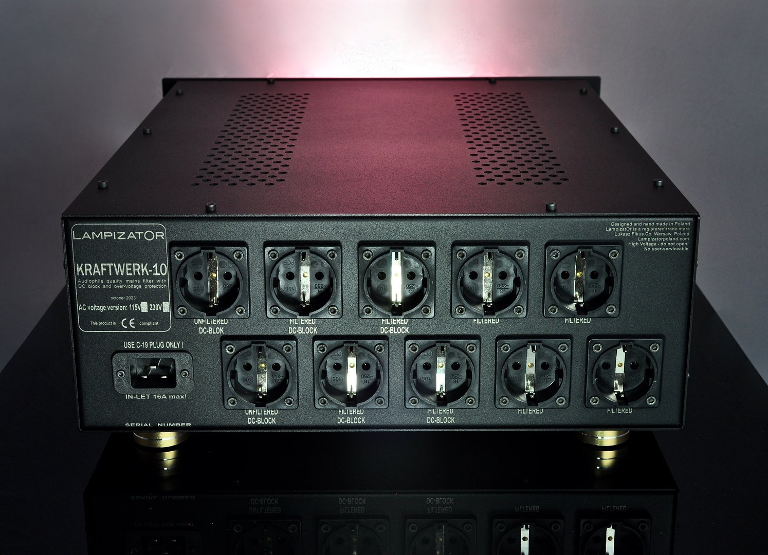 The Kraftwerk (German for Electric Power Plant) was conceived as a development of our 20 years old SILK project. We kept the good features like unrestricted, open sound, more analog style of presentation, better soundstage, easier to follow musical threads, darker background etc. We added 4 more filtered outputs and 2 unfiltered for the monoblocks. Another new feature is a DC blocker available for 4 filtered and 2 unfiltered outputs. We also added Voltmeter, Ampmeter, and much bigger chassis.