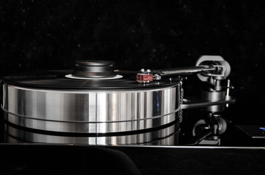 Tung og solid, veier 25kg. Hengslet acryl støvdeksel. 12" tonearm i karbon. Ettermontert Audio Technica armløfter.