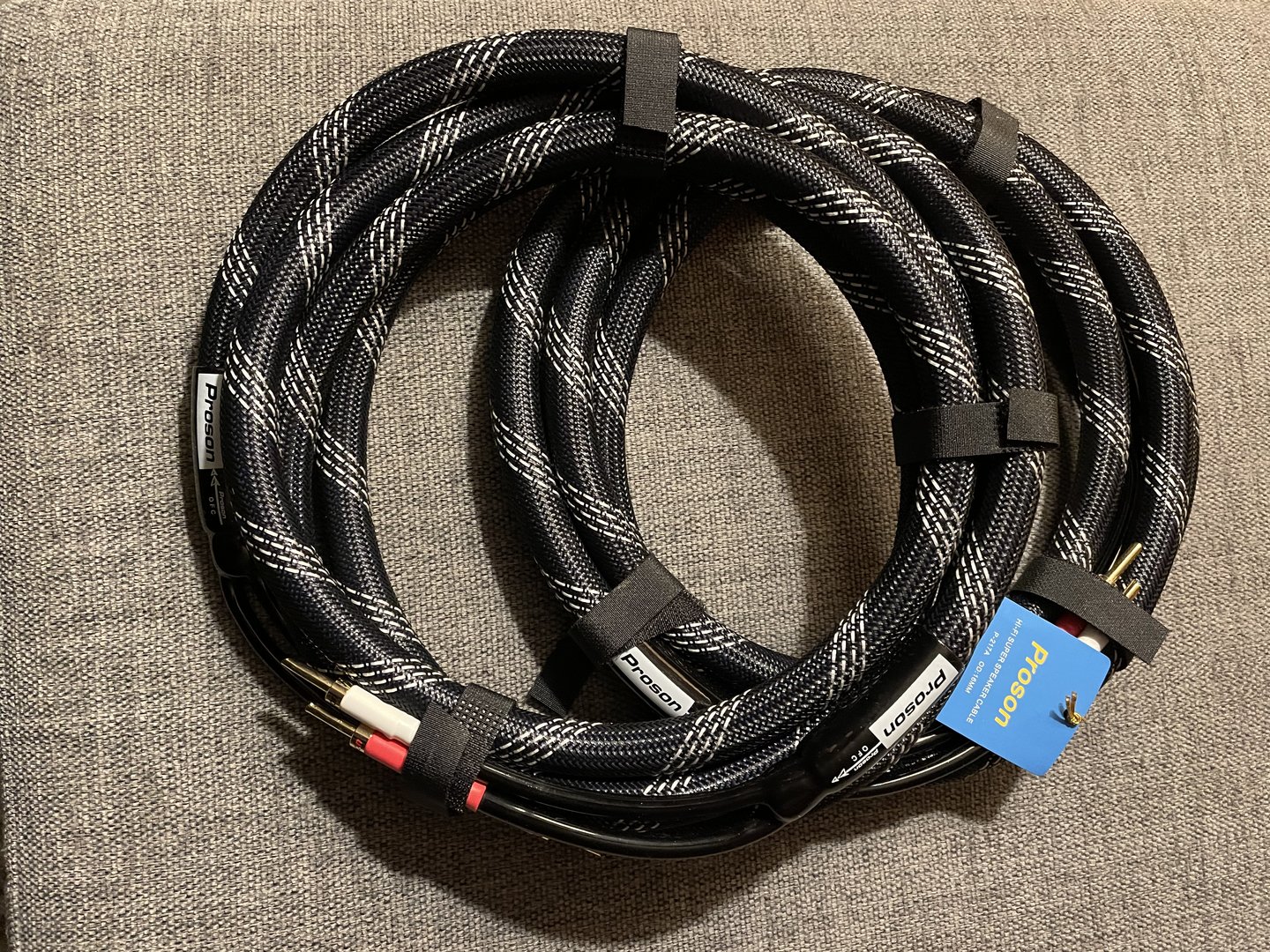 Proson høyttalerkabel selges til en rimelig pris, singelwire, lengde 2.5 m, terminering banan-banan. Kablene er ubrukt. Pris kr 500 Originalemballasje Nei Orig. kvittering Nei Forsendelse Kan sendes