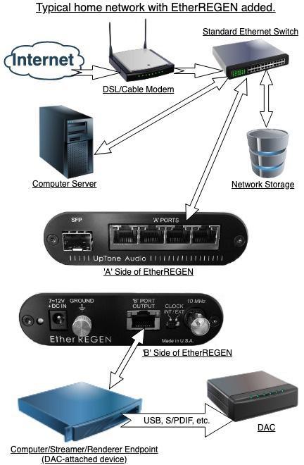 Advanced audiophile Ethernet switch with differential isolation and femto reclocking.