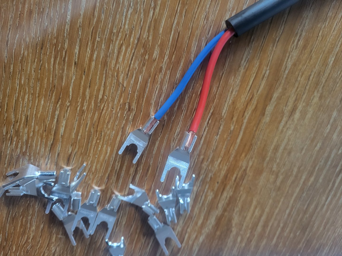 -Lodding av sånne krever selvsagt en litt kraftig loddebolt, men lodding og en liten bit krympestrømpe på akkurat de tror jeg blir flott.