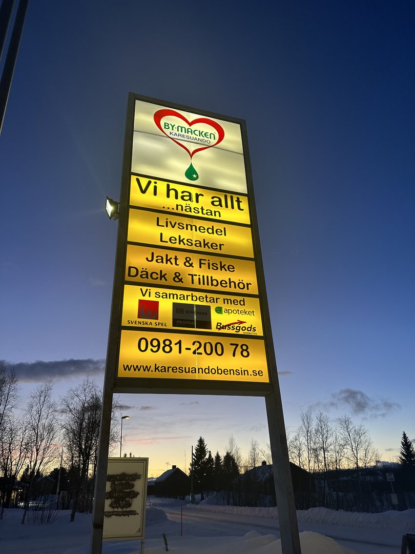 Over til svensk side av Karesuando for.et lite stopp for å bunkre snus hos «MacGyver», som vi kaller innehaveren for. Han fikser alt. Reklamen bør tas bokstavelig og her tales en salig blanding av svensk, finsk, samisk og norsk. Var litt bekymret for å kjøre over på svensk side, men vi gikk heldigvis klar av den verste gjengvolden.