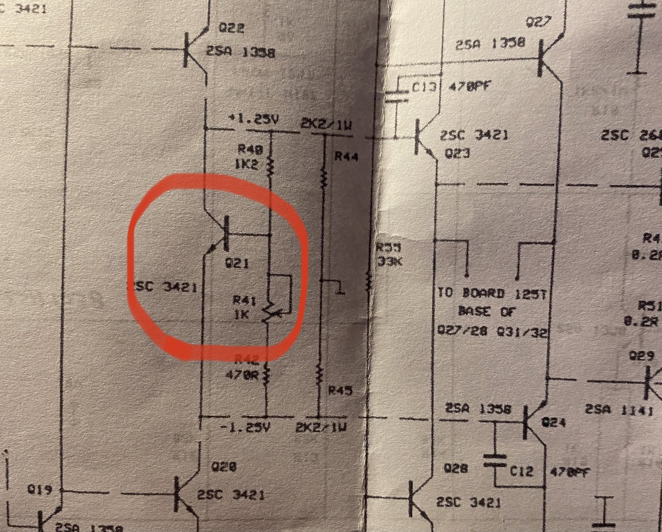 I tillegg til at det mellom Emittermotstandene er en "Red wire to Board 125T"