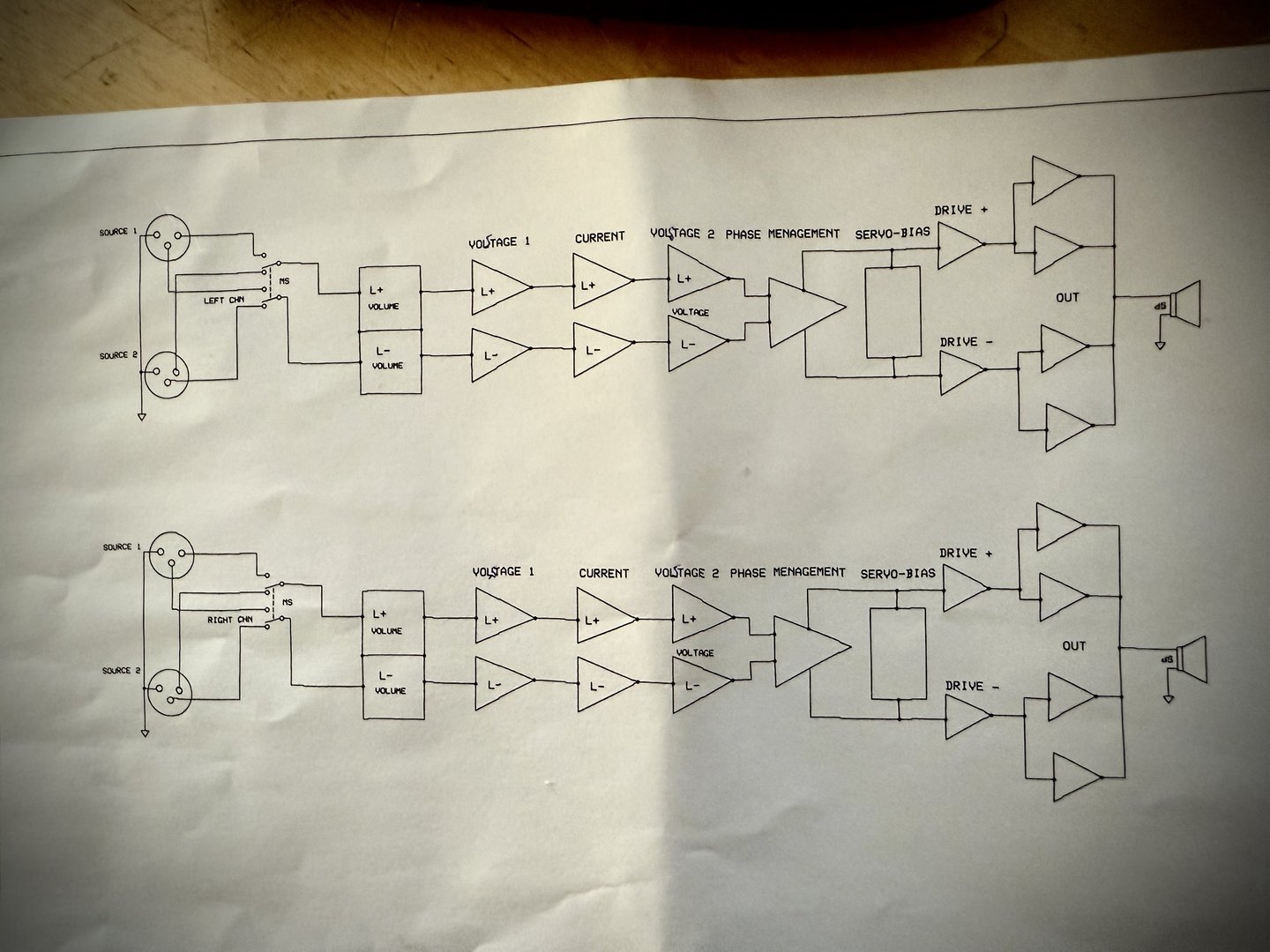 Det vedlagte blokkdiagrammet viser at forsterkeren er fullstendig fri for feedback. Den består av uavhengige kretser både til positiv og negativ fase for hver kanal. Den kjører i klasse AA med kontinuerlig regulering av hvilestrømmen (servo bias) slik at den ikke blir veldig varm i bruk.