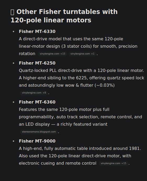 En kollega av meg har også en Fisher med den samme 120-pols motoren. Jeg antar at en slik motorkonstruksjon gir mindre rykkingognapping ("cogging") enn vanlig.