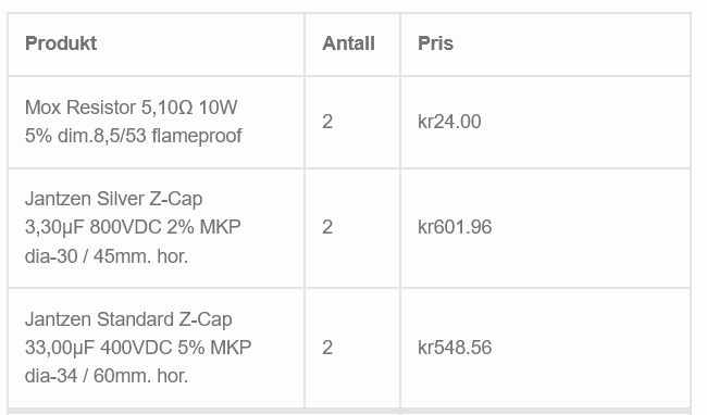 Bestilling sendt. Hadde egentlig lyst til å kjøpe spoler også, men tok til meg det med motstanden i dem, og at det kan være kritisk for hvordan systemet er tunet. Også har jeg ikke mulighet til å lodde dem ut og måle, så da får det eventuelt bli en annen gang. :)
