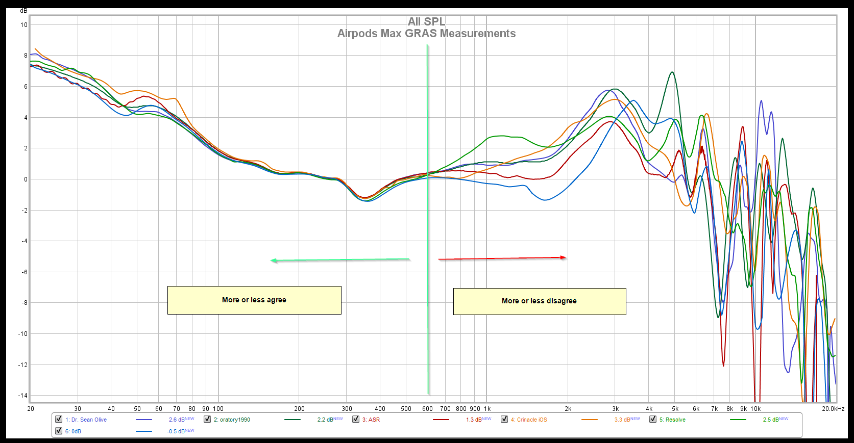 Jeg har aldri skjønt poenget med målinger av hodetelefoner generelt pga. HRTF, og når avvikene mellom målinger er så store som du viser, så smuldrer hele grunnlaget bort.Bildet jeg lastet opp viser ulike målinger av Apple Airpods Max lagt oppå hverandre. De ulike målingene varierer med mange desibel mellom 1 kHz og 10 kHz, så at de er mørke i toppen er ikke helt gitt - i alle fall ikke at de er så mørke som Amirs måling tyder på. Hele tråden diskuterer om sånne klokker kan måles på den måten, så det er ikke entydig at de er spesielt mørke i klangen.