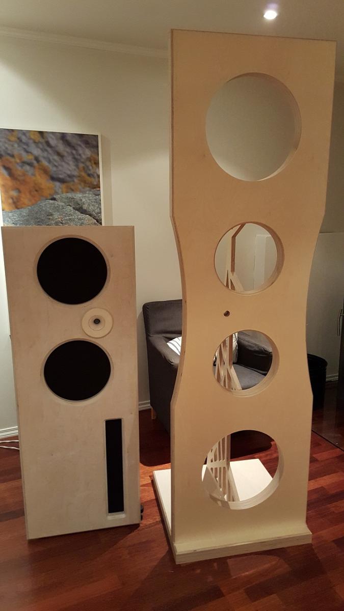 Ja. Det kommer flere bilder. Har snakket med Robert en tid tilbake ang en større høyttaler. Han brukte litt tid på å teste ut et alternativ til et ønske herfra. Det resulterte i denne baffelen og elementsammensetningen . Ja trøkk ble det. Og en vegg av vellyd. Men de krever mer strøm. Ikke noe for 10 wattere