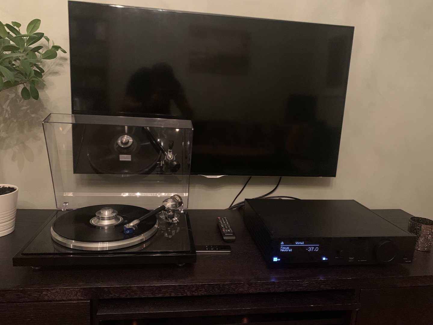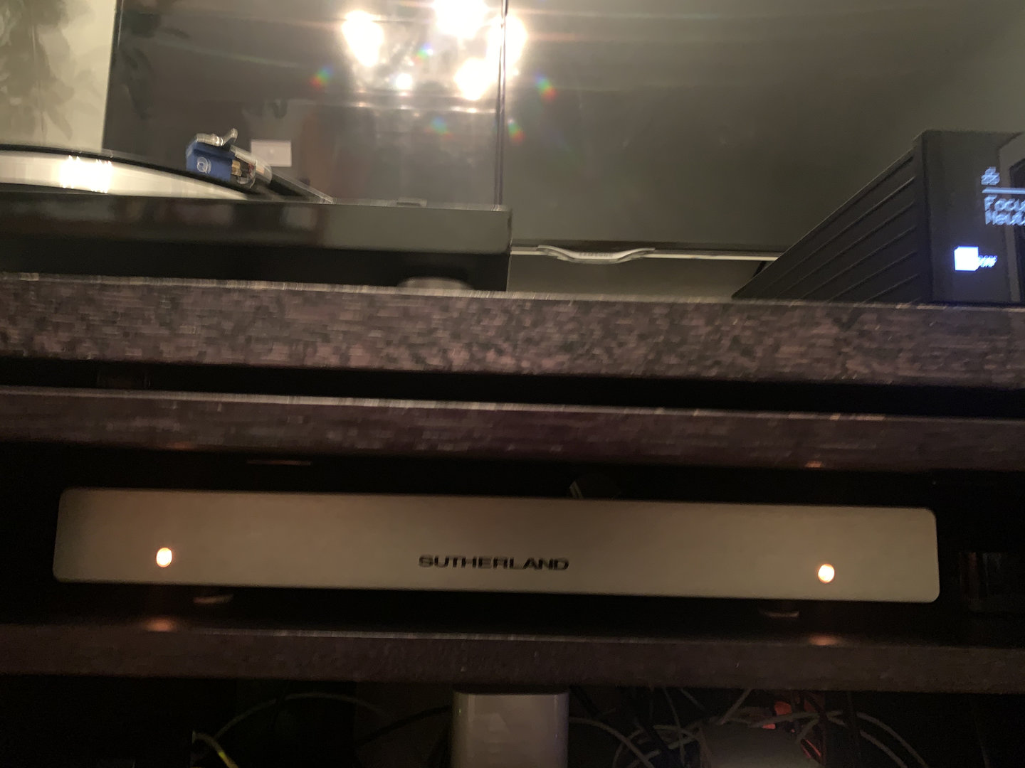 Til høyre EAT RIAA, til venstre strømforsyning til både EAT platespiller og RIAA.Hva er de to smale boksene på midterste hylle?