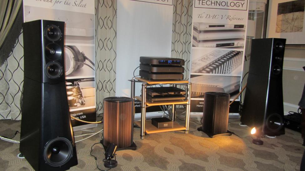 PCM høyttalere satt opp med miksepult. Man får et langt mer presist stereobilde ved å sitte slik i nærfelt. Klart det mest presise stereobilde jeg hørte på messen med stor vokal i sentrum. God fylde i lyden.