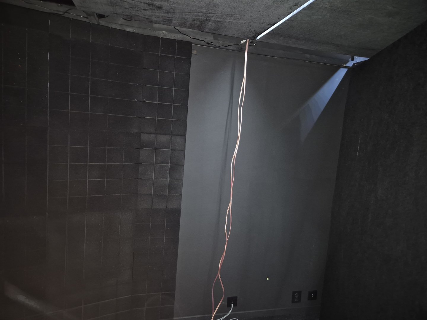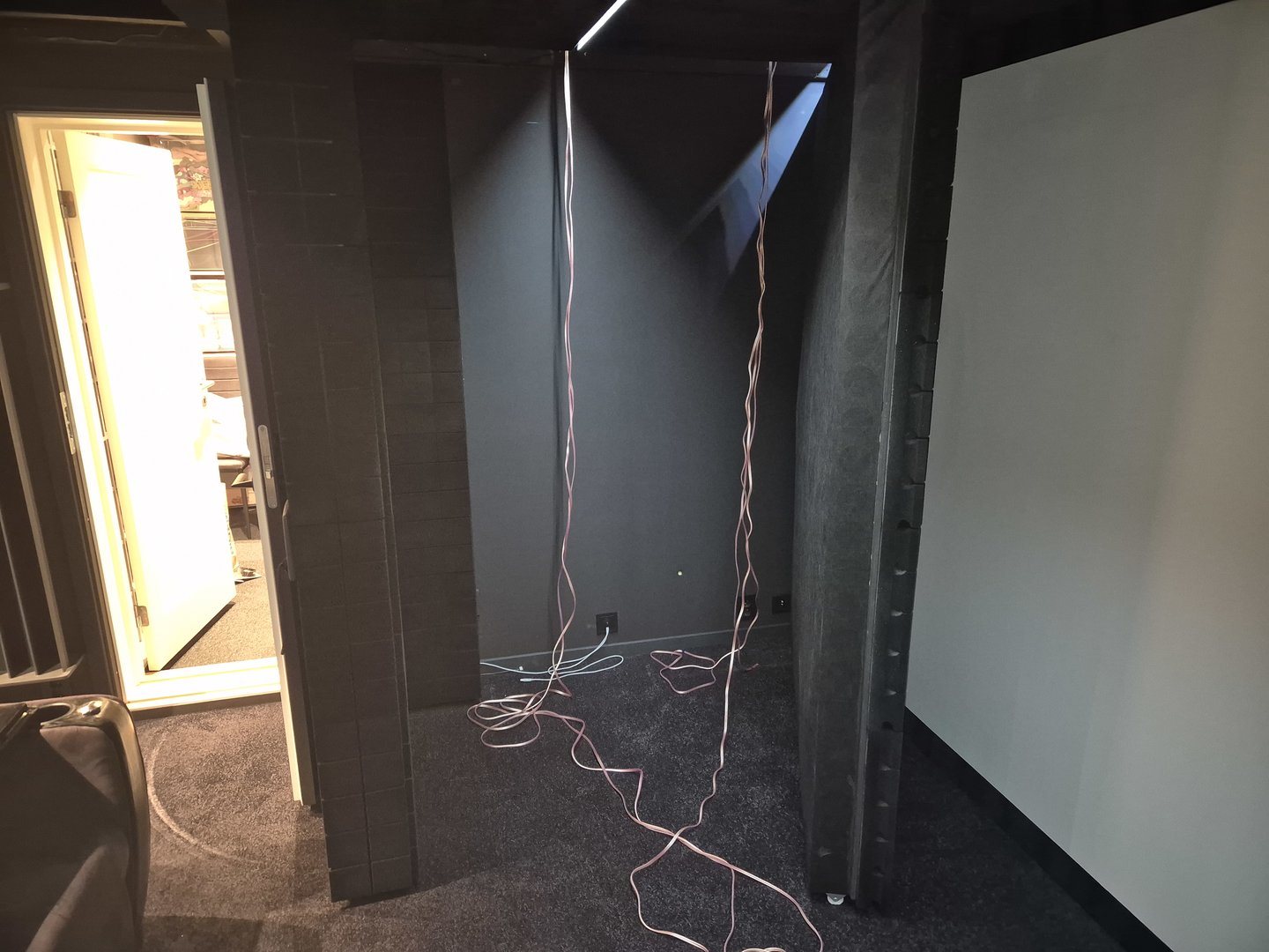 I førsterefleksjon tak er det 17cm rockwool med lyd transparent velour. Alt av rockwool har sort bark duk for å minimere støv.