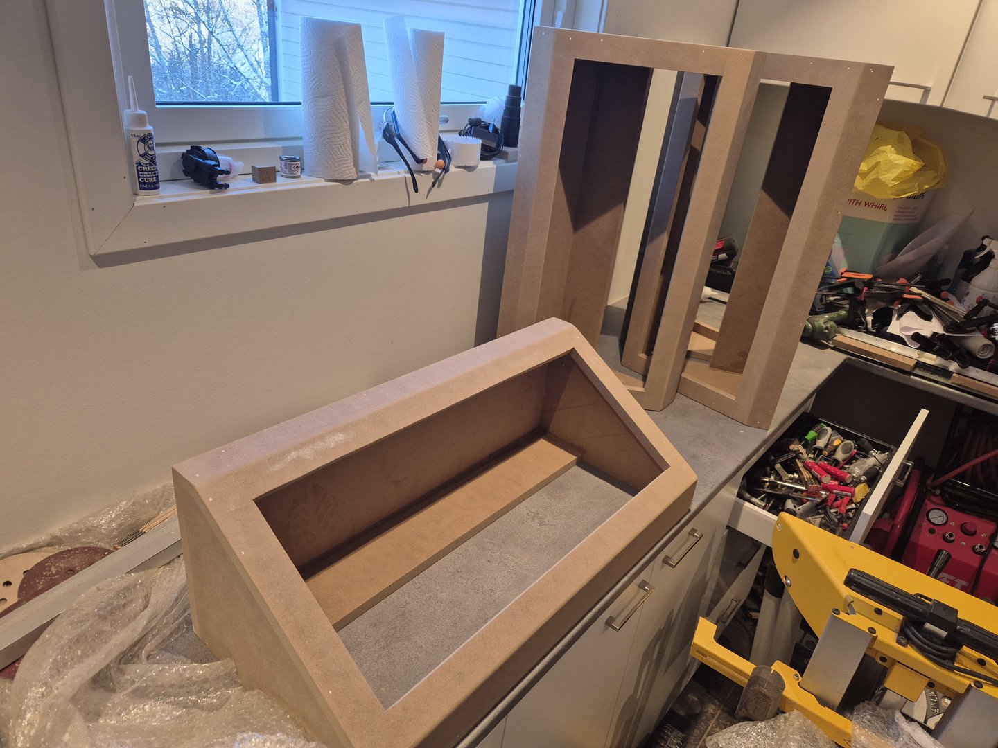 Så lånte jeg et par Svanå "diffusorer" av min far. Fy søren å det lille rommet vokste. Hadde aldri trodd det var et så lite rom, og jeg viste jeg måtte bygge meg noen. Ble tegnet av i endene for å lage mal, og lagde det jeg trengte. Finner ikke bygge bildene i farta, så legger ved et bilde tatt i nåværende kino.