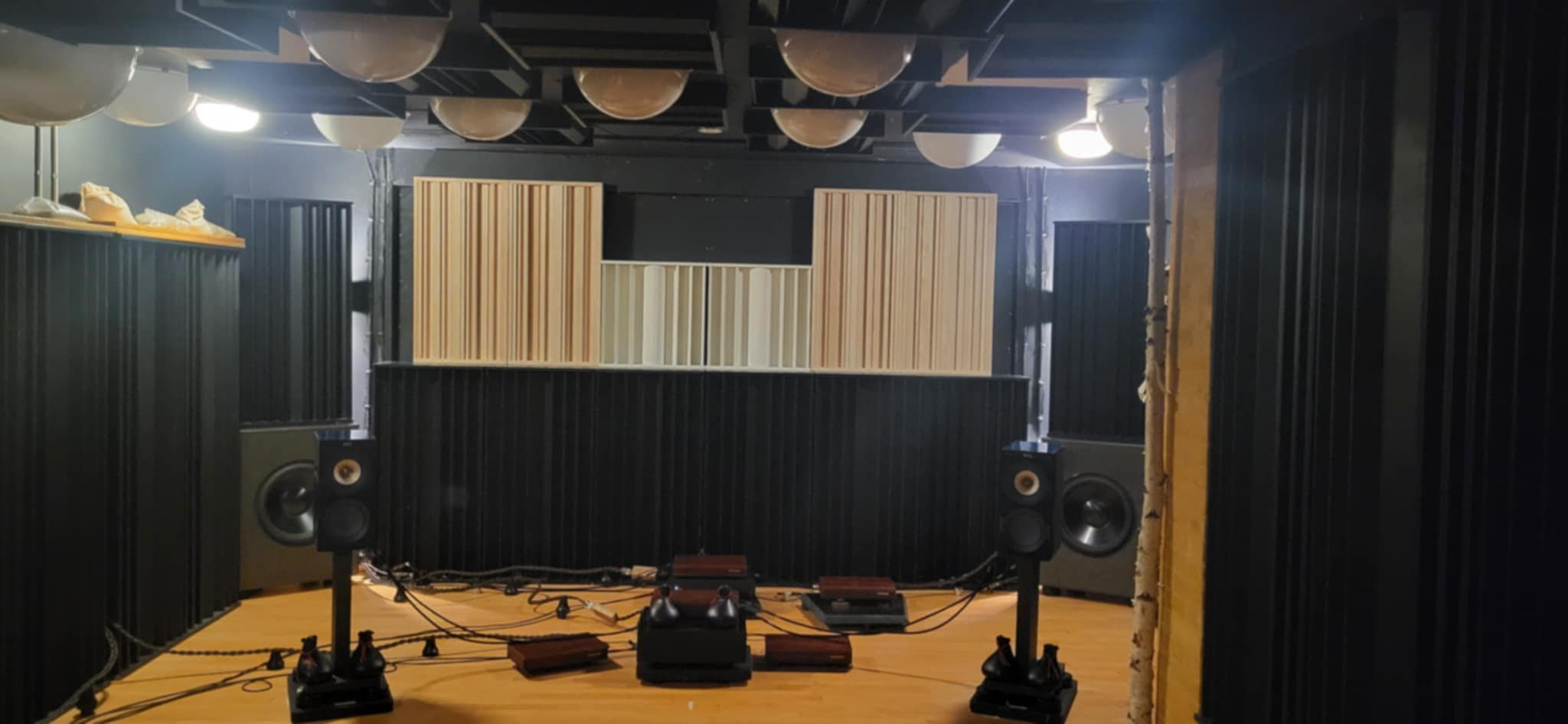 Højttalerne er flyttet langt frem i rummet, og det gør, at musikkerne står bagved dem og spiller. Subwooferne står i hjørnerne og styres med miniDSP Flex, så der tidsforskubbes. Man har muligheder med et eget Lytterum på 34 m2.