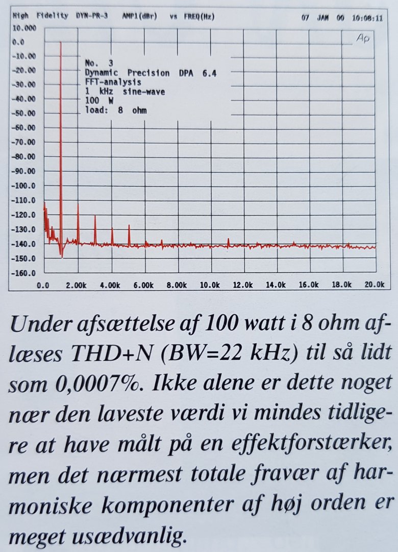 High Fidelity og andre målte nesten alltid ved 1000 Hz. Gir penere tall? Det er også der forvrengningen kommer opp over støygulvet? Det bemerkelsesverdige er at det ble målt ved 100 watt. Det vanlige er å se denne målingen med pusleeffekter som 5 watt eller noe der omkring..Denne måling er ved 1000 hz.