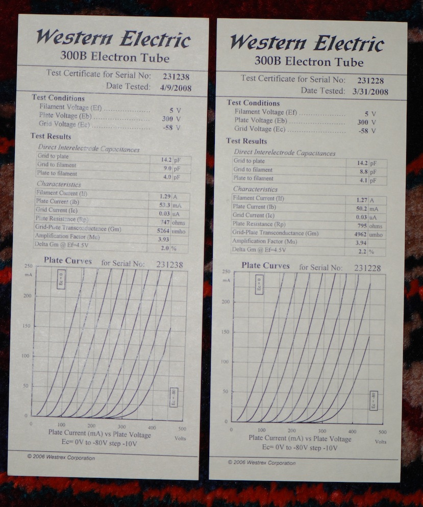 The domestic retail price for the 300B is $400.00 per tube and $900.00 for matched pairs. Each tube is serialized and packaged within the vintage World War II carton along with a printed documentation of its particular characteristics and curves. Matched pair cartons come in a wooden cherry box with the Western Electric company logo and "No. 300B One Matched Pair" engraved on the lid.