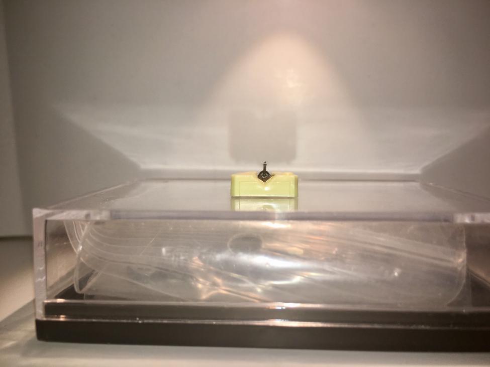 Har disse to nålene (se bilde under) til en Shure M75 pickup. Den lyse er av typen Jico (ikke SAS), og er den andre nålen jeg har fått fra Jico med skjev/rotert nålefane. Den lyse hoppet litt ut av rillene ved et par anledninger så den tør jeg ikke bruke. Den svarte er heller ikke helt rett, men en del bedre enn den lyse, selv om det ikke kommer helt klart frem her. Spørsmålet er om jeg løper noen risk her mtp. platesamlingen?