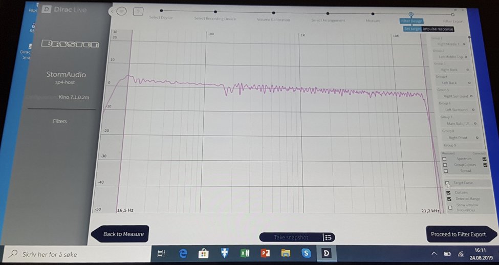 Personlig synes jeg Dirac sin target er for tam og trenger mer guff i bunn og opp til 150-200 hz. Man mister kanskje litt varme og opplevd dynamikk som følge av redusering av nivå i stående bølger og dermed tørrere lyd, og dette bør kanskje kompenseres noe med økt nivå.