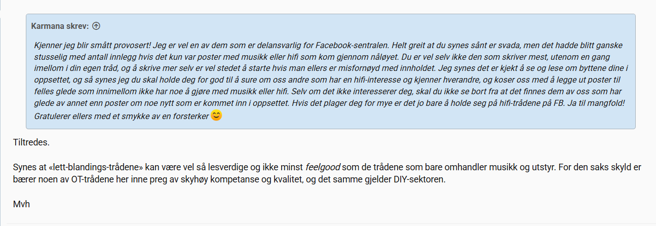 Kjenner jeg blir smått provosert! Jeg er vel en av dem som er delansvarlig for Facebook-sentralen. Helt greit at du synes sånt er svada, men det hadde blitt ganske stusselig med antall innlegg hvis det kun var poster med musikk eller hifi som kom gjennom nåløyet. Du er vel selv ikke den som skriver mest, utenom en gang imellom i din egen tråd, og å skrive mer selv er vel stedet å starte hvis man ellers er misfornøyd med innholdet. Jeg synes det er kjekt å se og lese om byttene dine i oppsettet, og så synes jeg du skal holde deg for god til å sure om oss andre som har en hifi-interesse og kjenner hverandre, og koser oss med å legge ut poster til felles glede som innimellom ikke har noe å gjøre med musikk eller hifi. Selv om det ikke interesserer deg, skal du ikke se bort fra at det finnes dem av oss som har glede av annet enn poster om noe nytt som er kommet inn i oppsettet. Hvis det plager deg for mye er det jo bare å holde seg på hifi-trådene på FB. Ja til mangfold! Gratulerer ellers med et smykke av en forsterker 😊