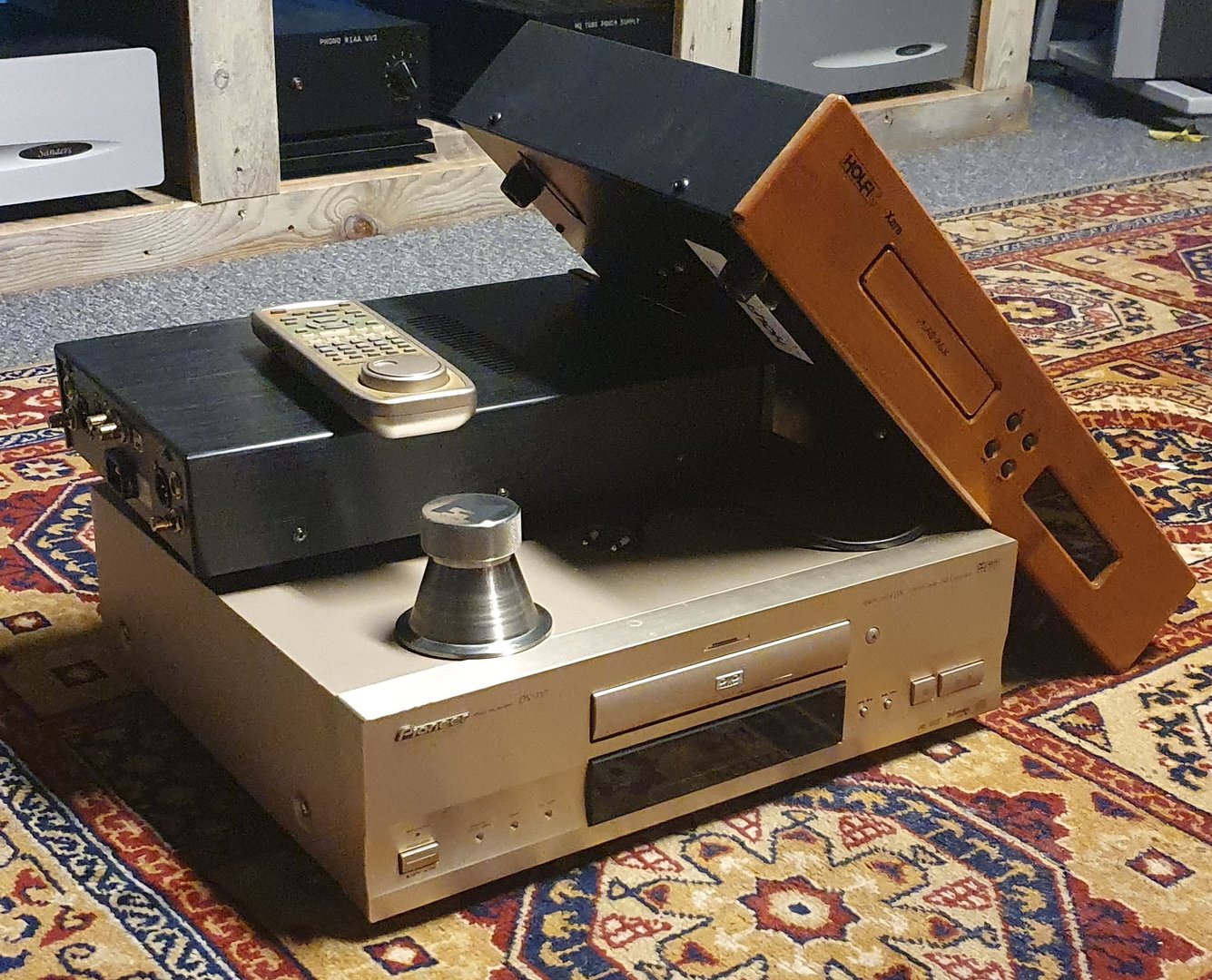 Det ble nesten utelukkende spilt CD hos HCS. Det var noe som ikke stemte med HCS' snurrer. Først vandret vokalen etter ca 20 sek til venstre siden. Fra lyttestolen så jeg at den den holdt på å skli ned fra benken (ok, en overdrivelse:ROFLMAO:!). Mannen hadde altså ikke engang giddet å sjekke en slik trivialitet. Tilfeldigvis(!) lå det et libelle vater rett ved siden av riggen, så det gikk kjapt å skru det hele i vater. Vi byttet også på høyre/venstre kablene fra phonoforsterkeren. Da ble vokalen sentrert igjen. Dessverre låt det tamt og uten pondus. Nå vet iaf jeg hvorfor HCS disser vinylavspilling og bruker spilleren sin (NAS) mest som pynt! Jeg ville ha dratt hjem en annen RIAA for å finne feilkilden. Det han har er så absolutt mer enn godt nok, så her er det bare å få den delen til å fungere, mate. Vil du pynte opp lytterommet, så mener jeg at en plastplante er et bedre/rimeligere alternativ, selv om den neppe gir samme kred 🤪!