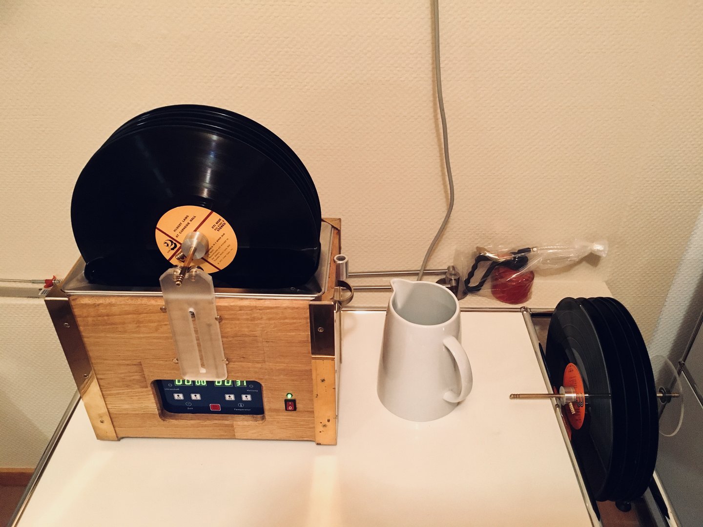 Jeg kan selvsagt bygge på reolen slik at spillerne blir stående bak en dør, men det gjør det ufattelig tungvint når en skal justere armer og pickuper - det er kronglete nok som det er. Jeg har vurdert en vegghengt installasjon hvor en hengslet plate i oppheist posisjon fremstår som diffusor/bilde mens den i senket posisjon gir en beskyttende plate over hele anlegget og for eksempel gir en absorberende flate også på vegg. Men jeg liker ikke å skru opp så faste installasjoner før jeg vet hva jeg trenger.