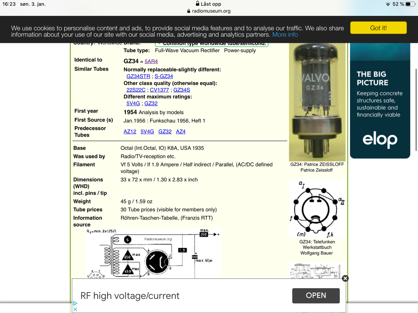 Det du spiller på nå har 5V ved 3A og er direkteglødet. Det sammenfaller med 5Z3P, men ikke med GZ34 som har 5V ved 1,9A og ikke er direkteglødet. Men da har vi egentlig funnet ut av det, for da må riaaen takle begge deler i og med at de leverer med noe annet enn de spesifiserer. Jeg var primært redd jeg hadde en gammel riaa og ny manual slik at det ikke var samsvar.