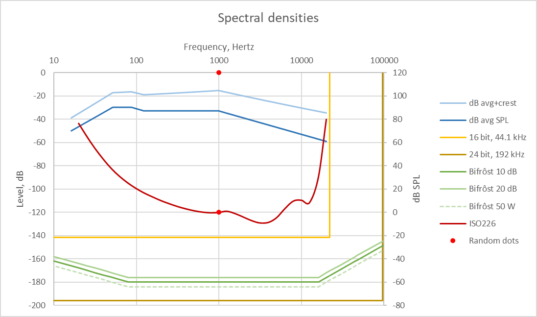 Den røde kurven er ørets følsomhet ihht ISO 226, tidligere kjent som Fletcher-Munson-kurven. Dette viser høreterskelen for en enkelt tone ved en viss frekvens i et stille rom. Siden de 120 dB er smerteterskelen ("full utstyring") kan vi regne nedover derfra og få -120 dB ved 1 kHz, tilsvarende 0 dB SPL. Tone-lignende lyder under denne kurven greier vi ikke høre, selv om de presenteres enkeltvis og uten noen andre maskerende lyder. Lyden av en mygg i den andre enden av et stille soverom, fem meter fra nesetippen, er omtrent 0 dB SPL ved 450-550 Hz.