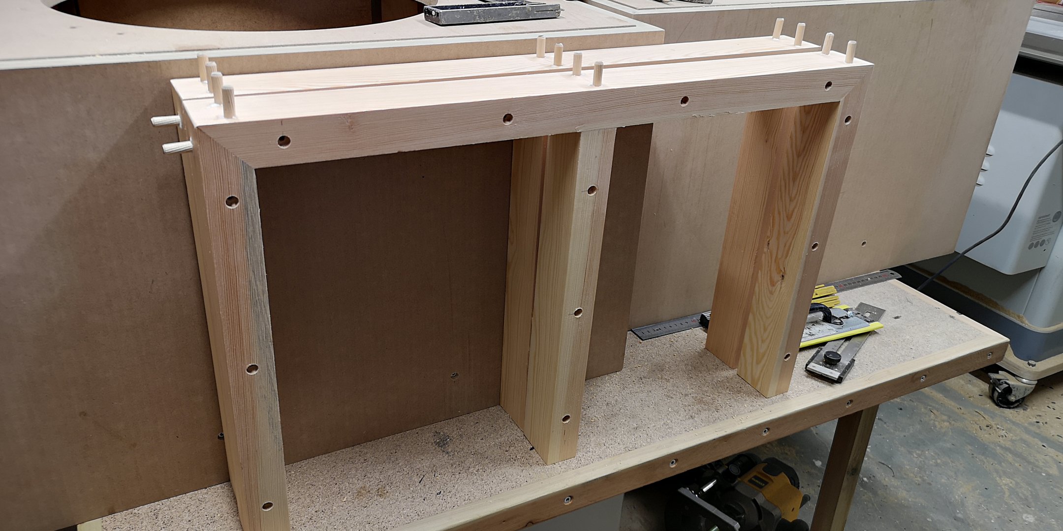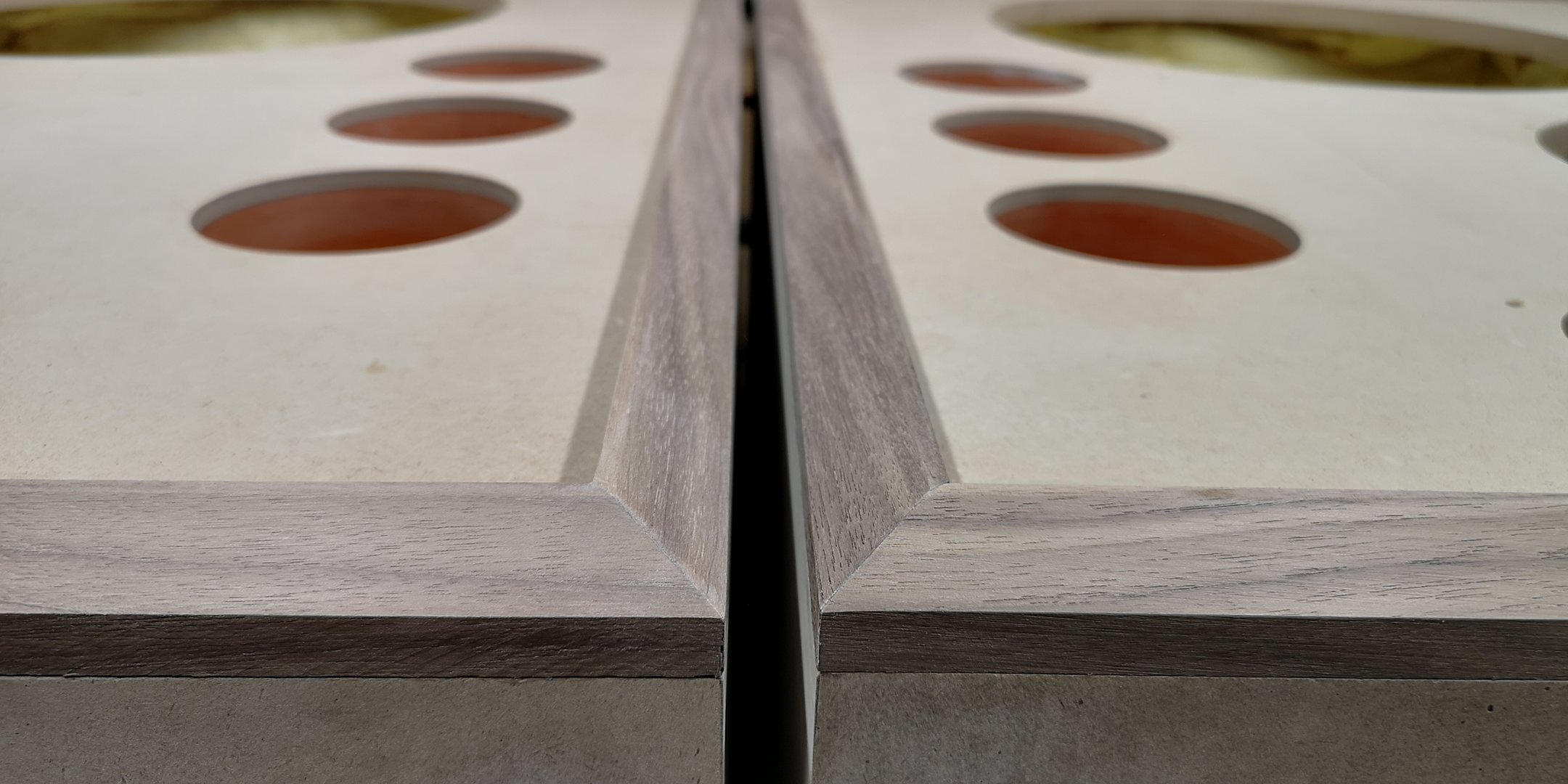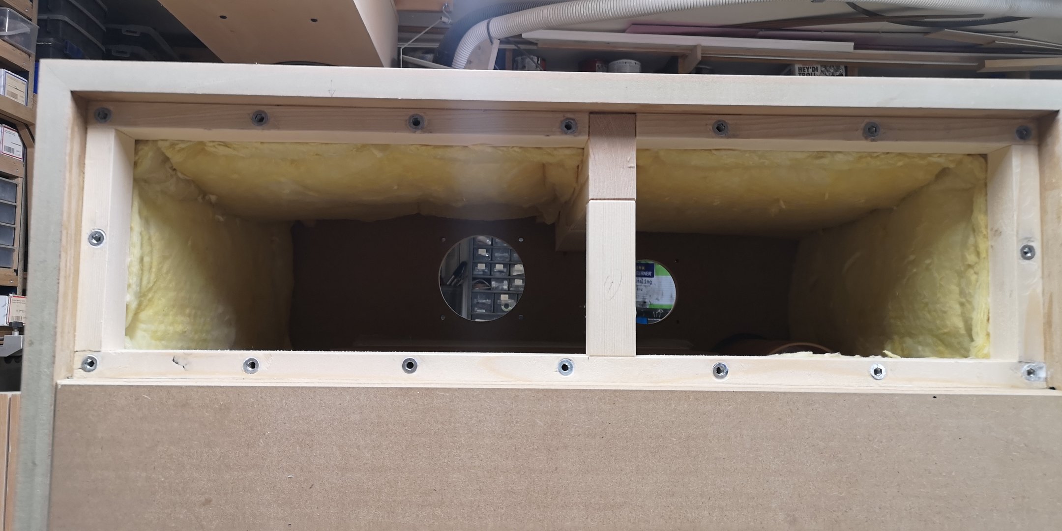 Baksiden av baffel har nedfrest spor til den indre kassen til mellomtoneelementet. Tre stk bassrefleksrør skal felles ned i portene, så en mal ble laget for nedfellingen. Jeg har funnet frem litt elementer også, for å sikre at monteringhull blir rett plassert: