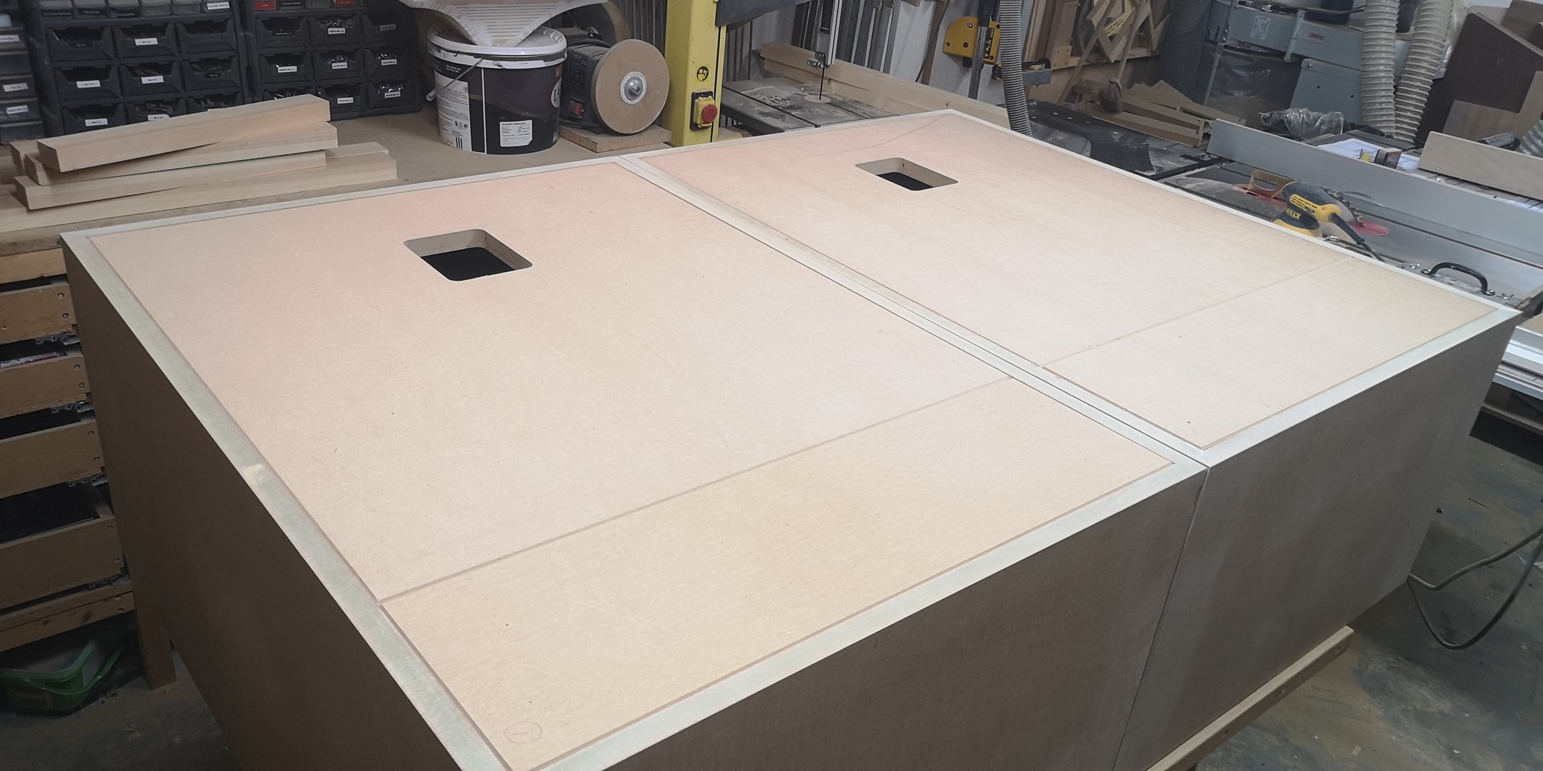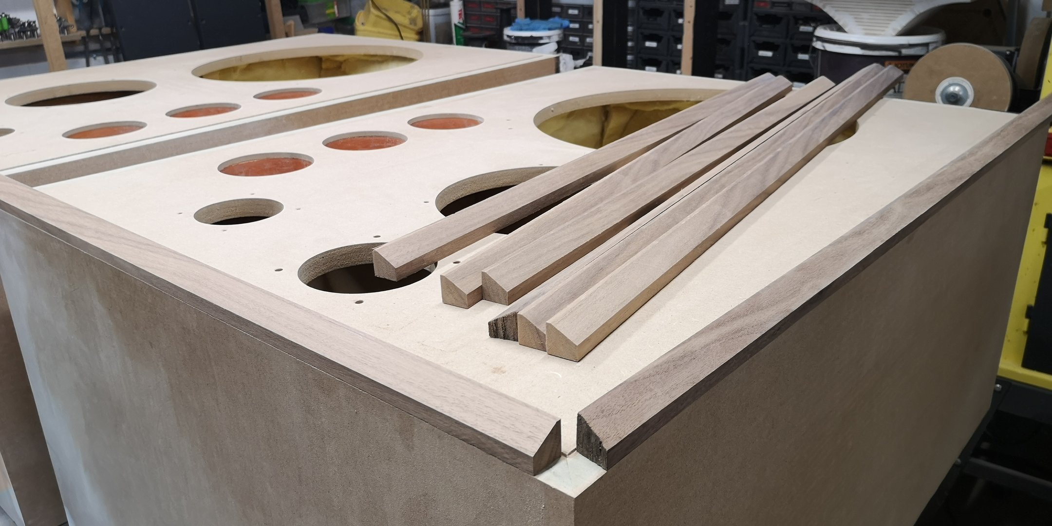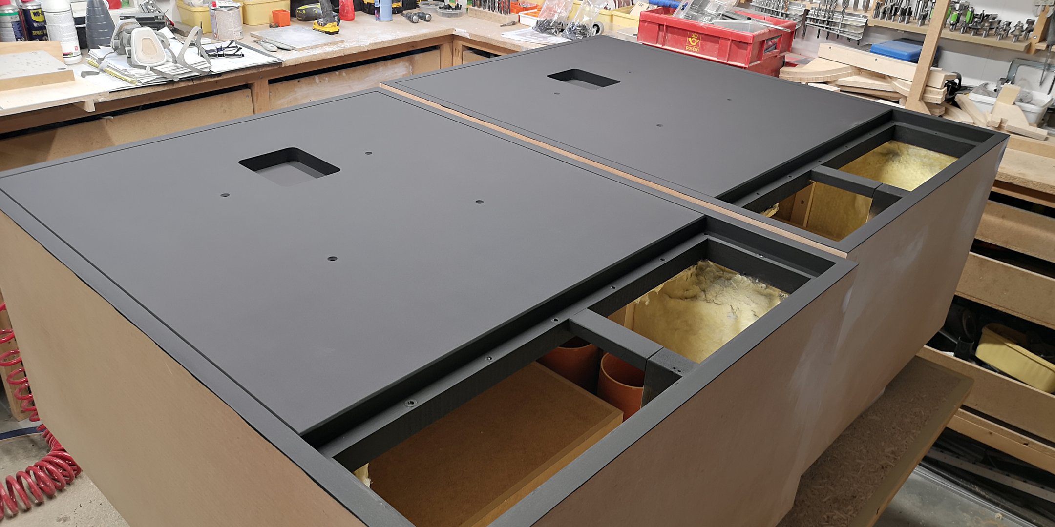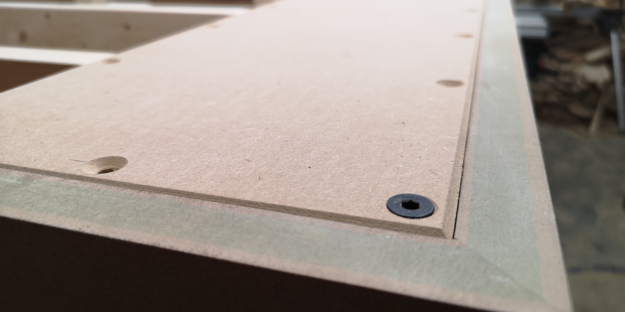 Baksiden av baffel har nedfrest spor til den indre kassen til mellomtoneelementet. Tre stk bassrefleksrør skal felles ned i portene, så en mal ble laget for nedfellingen. Jeg har funnet frem litt elementer også, for å sikre at monteringhull blir rett plassert: