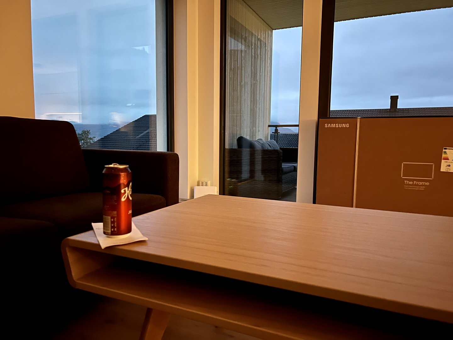 Ser føre meg ein lav tv-benk ved vindauga mot balkongen. Høgtalarar enten på benk, eller stativ/golvståande på kvar side av benken. Føler meg nær ei løysing, men ikkje nær nok til å dele no.