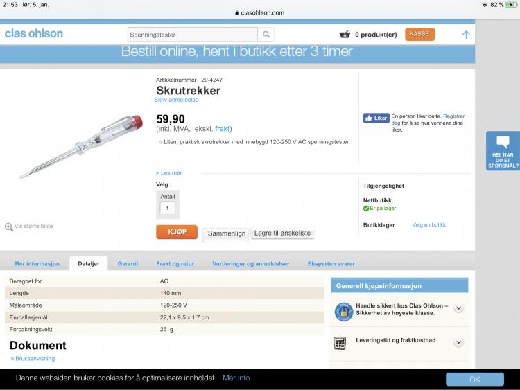 Denne er billigere og fungerer like bra. Støpselet settes i veggen eller strømskinna og du setter skrujernet inn i høyre hull og holder fingeren på toppen (av skrujernet). Lyser det (i skaftet på skrujernet så er det bra, hvis ikke så snur du støpselet. Fikk tipset av Frank på Very fine solutions. Meningen er at høyre side på kabelen har spenning, mens den andre er nullpunktet.