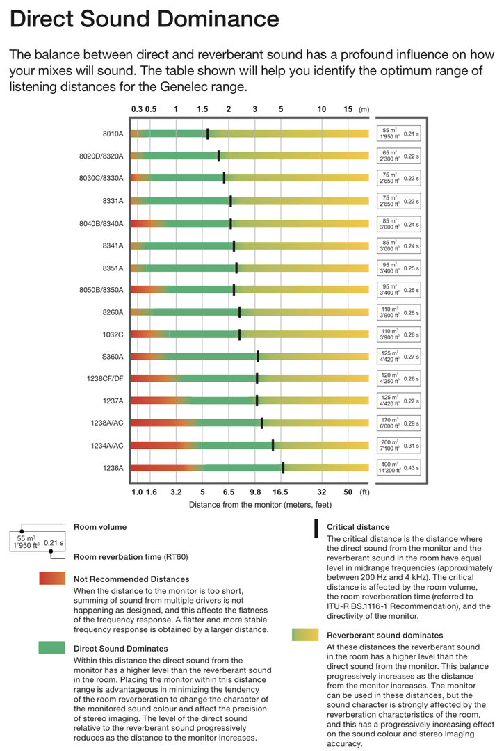 «The critical distance is the distance where the direct sound from the monitor and the reverberant sound in the room have equal level in midrange frequencies (approximately between 200 Hz and 4 kHz). The critical distance is affected by the room volume,