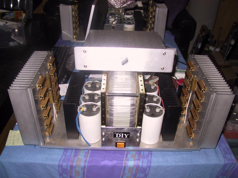 I build the amplifiers like an "open" construction, to loose as much heat as possible, without using any noisy fans. The height on the mounting plates for the transformer, and the large heat sinks are the same. This makes it easy to close it, with a front, top and a back plate, if preferred. To put up with the 30 watts, I used a 2500 VA transformer, delivered by Ulveco. http://www.ulveco.no A total of 182000 microfarad capacitors, all each monoblock. I have used the RIFA PEH169 capacitors. Welcome All the heatsinks comes from Alutronic. PR-186 and PR 172, you can get them at any lengths. Alutronic Kühlkörper GmbH & Co. KG I also paralleled 6 pcs. of 47 ohm 50 watts resistors, instead of using one 250 watts 8 ohm resistor. By doing this I spread the heat better at the heat sinks. I also used another transistor IRFP260. It is placed all alone on its own heat sink. At last I had to add a "soft start circuit", the fuses in my house do not like the hit of that large power supply. The dimensions are: W:65cm, D:30cm, H:25cm, and the weight are 45kg. All each monoblock. I must say that I am very pleased and happy with the sound. It is sweet, open and very detailed. I think, some of the best I ever heard. I have also build the "Balanced Zen Line Stage" is has a more ordinary look. Thanks for your personal contribution during my construction period.