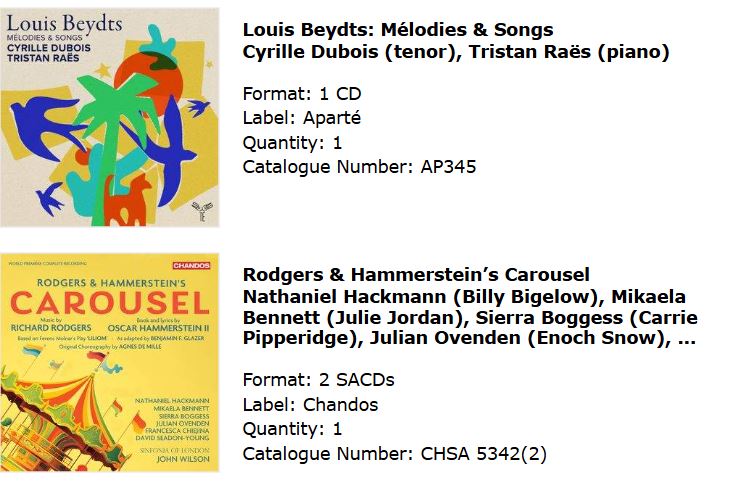 Jeg skjønner virkelig ikke hvordan dette finner titler på den nettsiden. På telefon er det umulig å finne frem. Søkte klassisk og fikk Neil Young!iMusic er fordømt behjelpelige. Svisj så la de på noen sølvplater på den bestillingen for meg. 279,-, fri frakt: