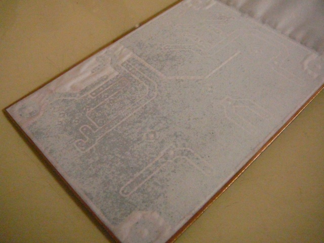 Jeg måtte gå litt over med en sånn lakk-tusj får å reparere litt. Det er ikke overalt at utlegget har blitt overført bra nok. Kortet kan nå etses på vanlig måte.
