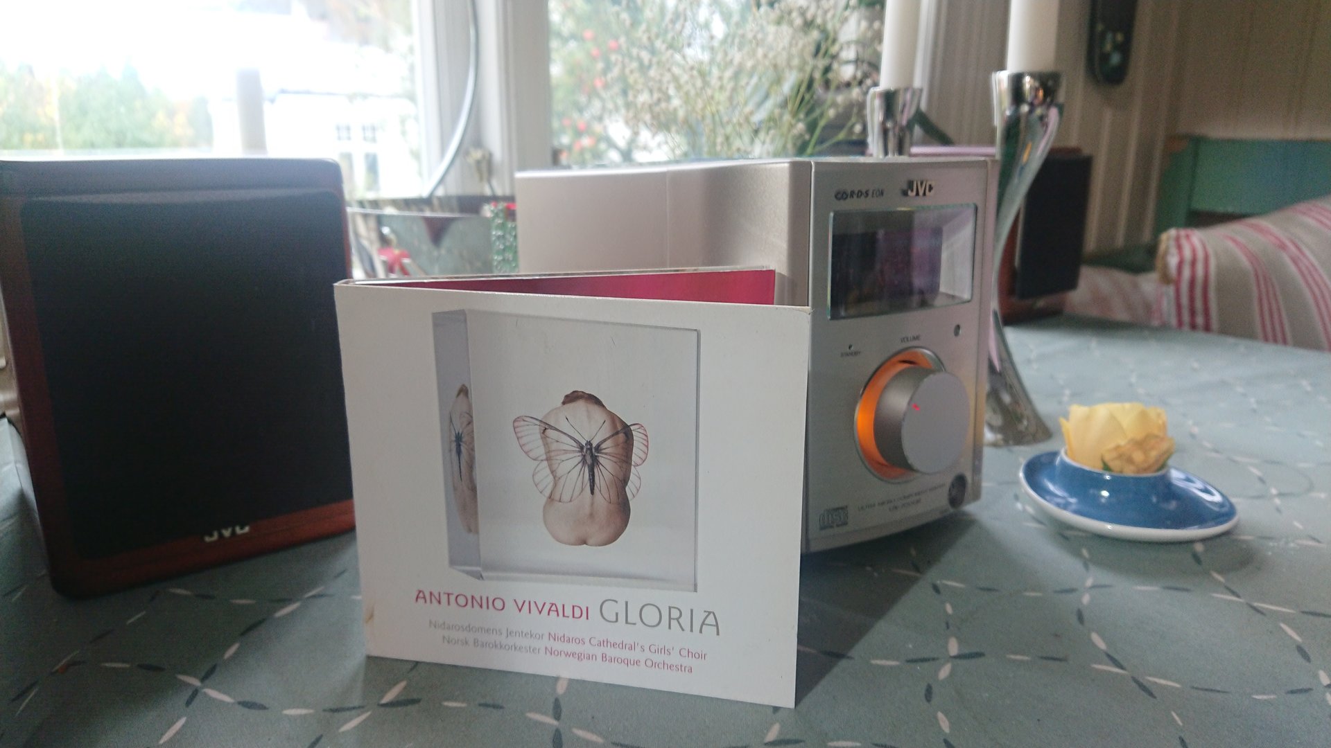 Besøket i går førte både til flere bøker og litt av hvert.. Jeg fikk med meg hjem en pose med CD'er og et, jeg må si ganske vellydende Micro JVC anlegg. Det virket jo såklart ikke, men ila et glass vin eller 2 fikset jeg det i går kveld. På morgenen i dag har jeg spillet en av CD platene, Vivaldi Gloria, gitt ut på Kirkelig Kulturverksted i 2003. Lenge siden jeg virkelig har nytt musikk på denne måten må sies. For en god produksjon dette er og tolkningen av musikken! Fabelaktig..