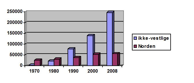 I 1970 hadde vi 3 549 ikke-vestlige innvandrere, kontra 26 548 fra Norden. Ikke-vestlige utgjorde 0,6 prosent av innvandrerbefolkningen den gang, mens de nordiske utgjorde 44,8 prosent. I 1980 er tallene 22 382 ikke-vestlige mot 31 210 nordiske, henholdsvis 23,5 prosent mot 32,8 prosent nordiske innvandrere av den totale innvandrerbefolkningen.