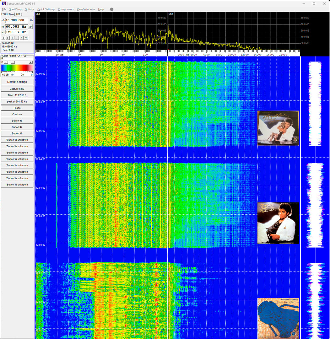 Spectrumet viser lavfrekvent støy på nedlastet fil X og MJ 1982, men redigert versjon av MJ i 2001