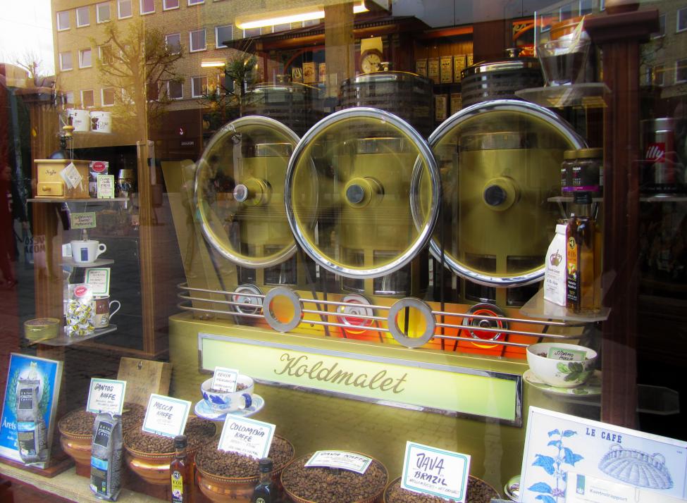 Svinghjulene til tre av de seks kaffekvernene der inne som er med å bre den fantastiske duften inne i lokalet..