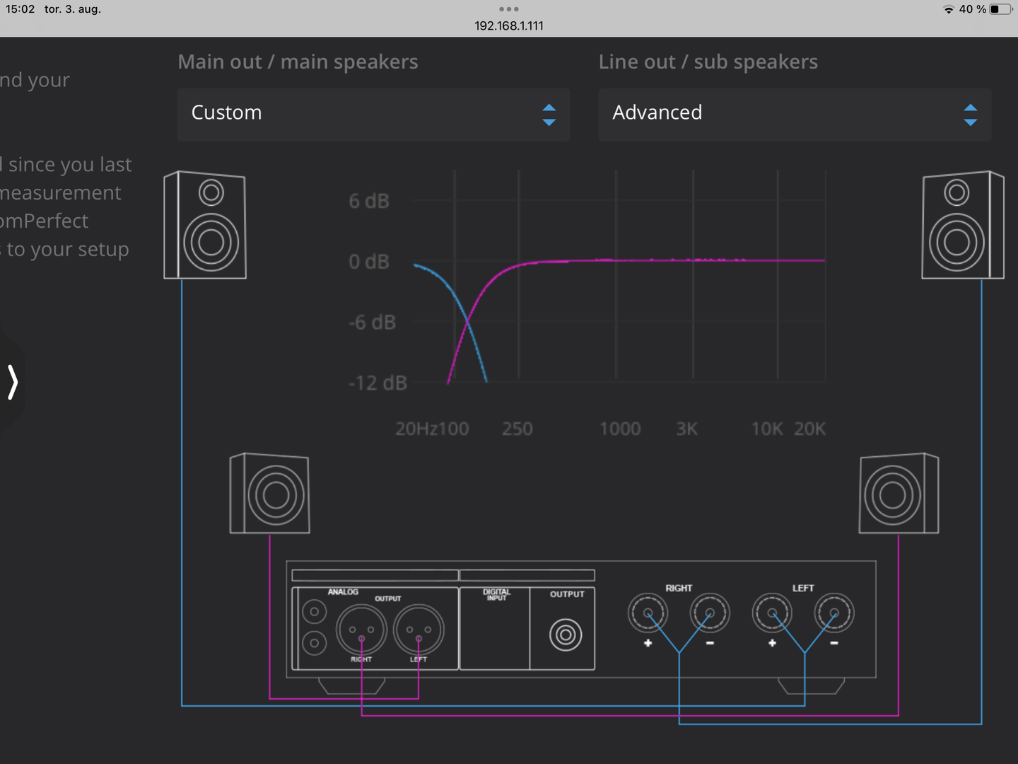 Hei. Jeg har 2200. I Routing stiller jeg inn om jeg skal ha filter på høyttalerne og klikker på riktig lavpass og høypassfilter. Lurer på om du kan legge inn avstander på mainkanalene og bare legge inn som bypass på Line Out? Det kan være en annen meny på 3400, men det bør uansett være mulig å legge inn forskjellig avstand på høyttalerne. Det er jo mye av vitsen med å bruke Lyngdorf med eller uten Room perfect.Har 3400 å hadde 2 subber,de er solgt nå,da jeg hadde subbene å skulle justere på output setup på lyngdorf kunne jeg måle cm avstand fra focus til subbene,kunne også måle høytalere likens..nå er som sagt subbene borte å jeg setter output setup på standard stereo men da forsvinner målingene i cm,kan ikke huske det var sånn før?