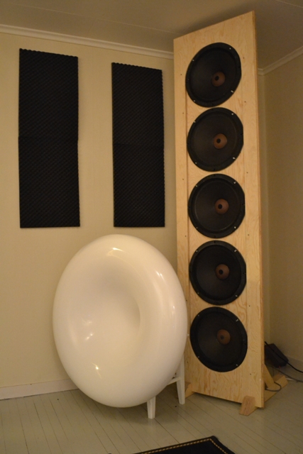 bildene jeg la ut er fra testing av horna og baflene i det gamle lytterommet. Horna er bare plassert på noen krakker jeg tilfeldigvis hadde stående. Baflene med 515GHP fungerer meget bra som midbass og minner lydmessig om doble 816a pr. side. Etter litt testing med eq ble det åpenbart at 4-veis er veien å gå hvis jeg skal beholde elementene og det smekket de er istand til å gi.