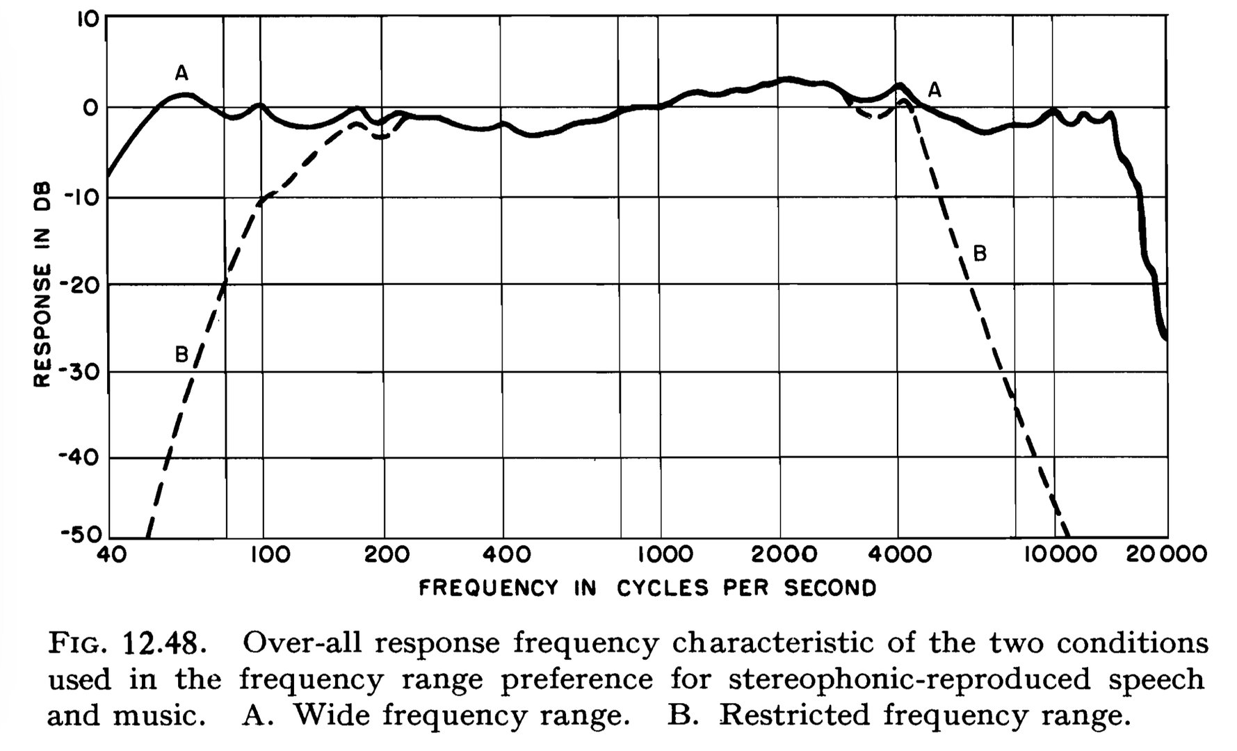 Ad 2: Den andre figuren ledsages av følgende tekst: «The over-all response frequency characteristics depicting the ratio of the sound pressure output from the loudspeaker in free space to the sound pressure at the microphone in free space, with and without the electrical filters, are shown in Fig. 12.48»