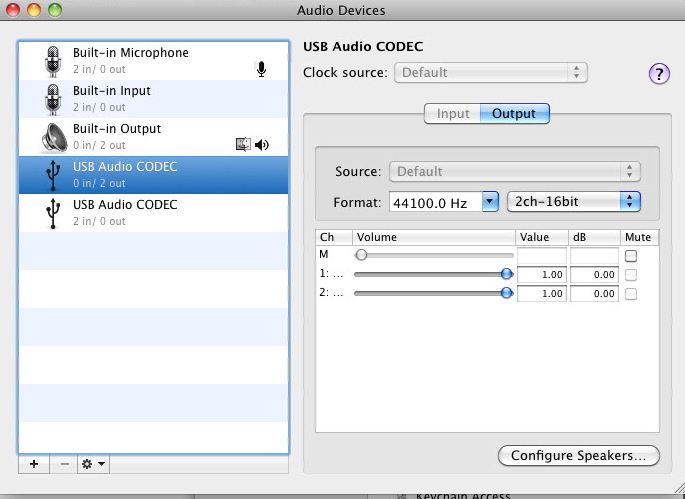 For å skifte til USB Codec: Høyreklikk (eller hold inne ctrl og trykk, hvis du kun har 1 knapp på musen) på USB Audio Codec (0in/2out) og velg "use this device for sound output".