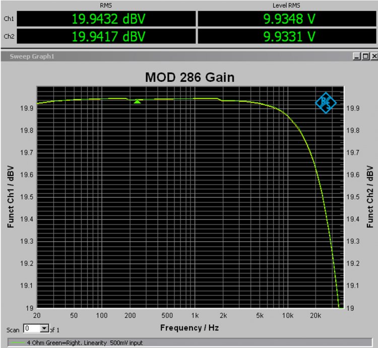 Merk skalaen til høyre! Input er 500mV så vi kan se at gain er 26dB. Lineariteten er innenfor 0,03dB opp til 6kHz og ruller av med -0,35dB ved 20kHz.