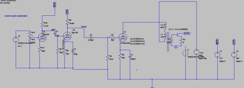 går allerede på 80 mA og 385 Vol anode-kathode, peanuts for KT120. En simuering med lavere Rk og 100mA viser effektendu sier men bare 0,5 db i dette verktøyet. kan vel likegjerne øke C3 mellom driver og KT120?