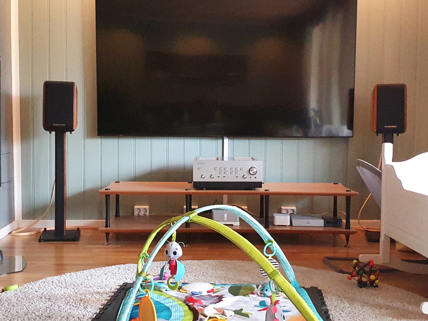 Som bildet viser så er dette en litt typisk stue som ikke er, eller kommer til å bli, særlig behandlet med akustikk-remedier. Midt på gulvet kryper det en liten miniterrorist med kleptomanpølser, men det vokser han fra etterhvert ellers må han teipes fast i veggen ;)