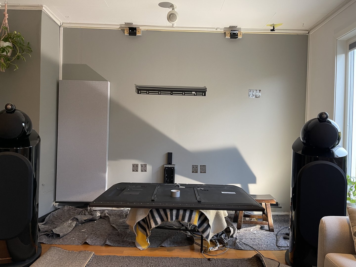TV er 75" og øyehøyde er 1m i kinoen. Dette gir ca 40cm å gå på under tv og ergo ikke plass til senter....