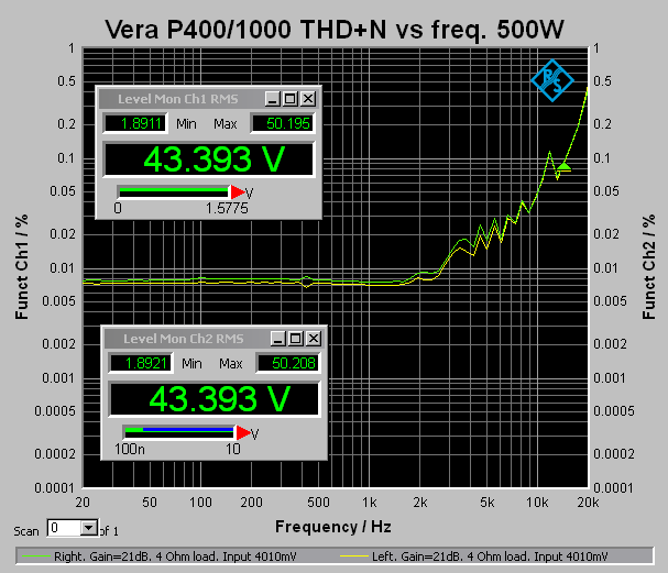 Blir spennende å se hvordan den yter på parametere som støy, forvrenging og dempingsfaktor, og ikke minst reell effekt ut - spesielt tatt i betraktning at strømforsyningen i den er kun 950VA med totalt 48000uF kondensatorbank....